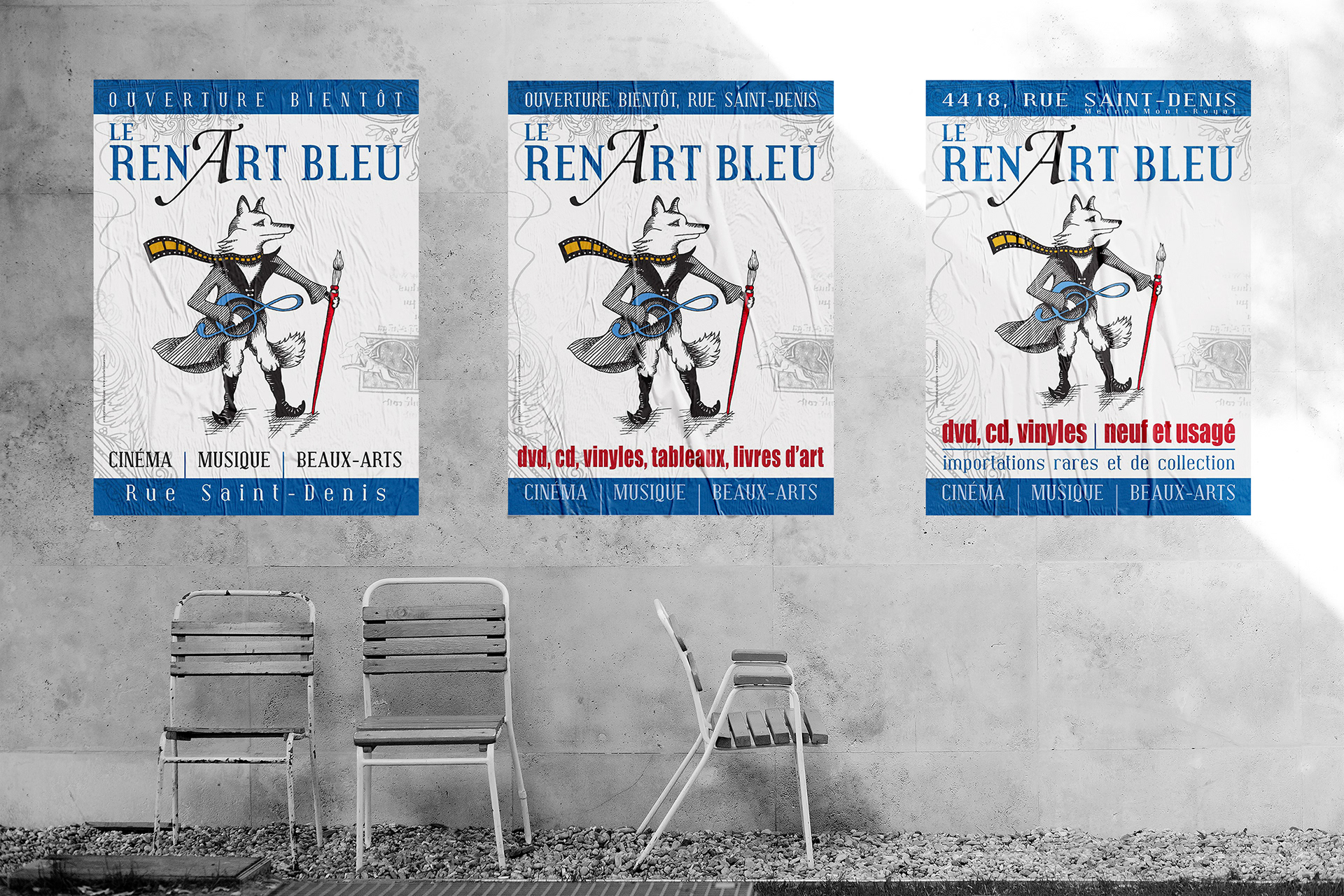 Conception de 3 affiches pour l'ouverture de la boutique le Ren'Art Bleu, boutique multi-culturelle de Montréal.